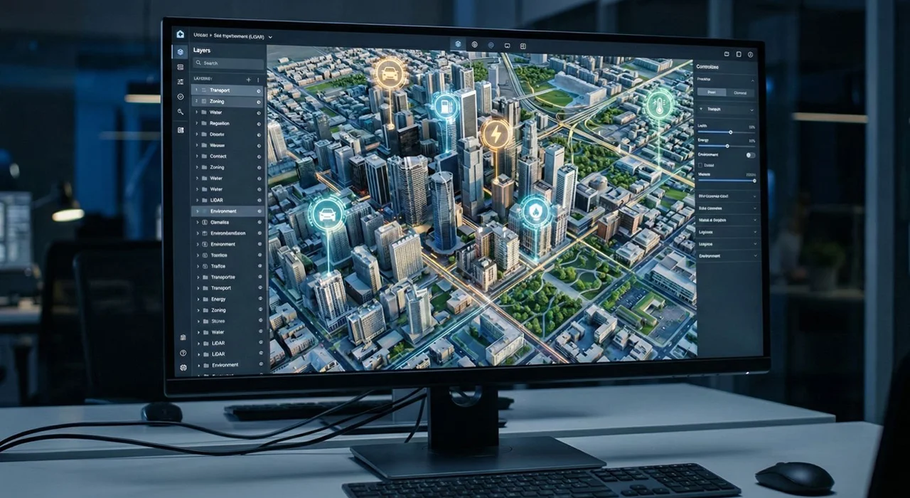 Integração de dados espaciais e modelos tridimensionais em plataformas web interativas. Transforme informações complexas em visualizações claras para gestão territorial, planejamento urbano inteligente e apresentações de impacto.